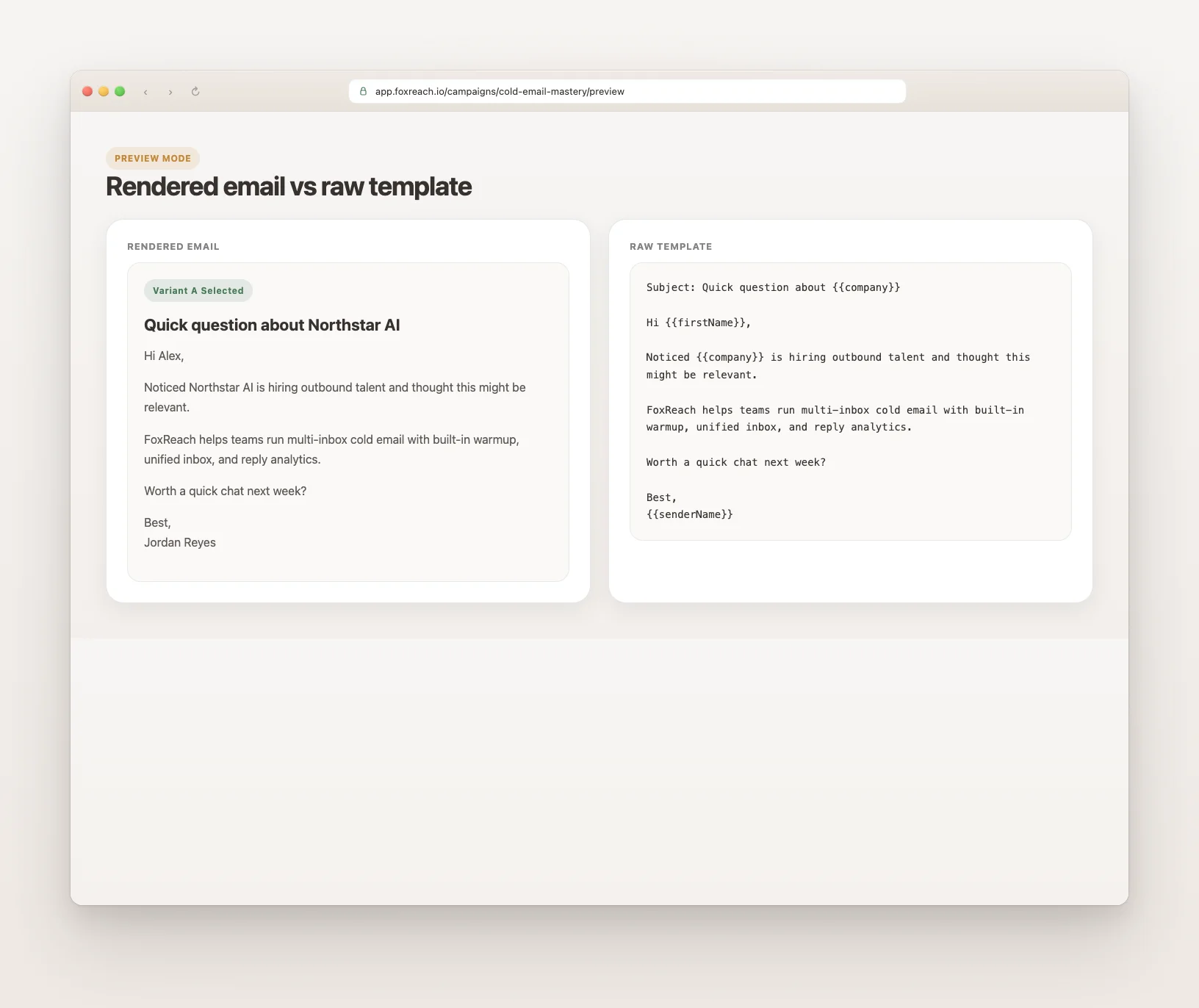 Before launching a campaign, use FoxReach's email preview feature to see how your spintax and variables render for specific leads. This shows you exactly what each recipient will see.