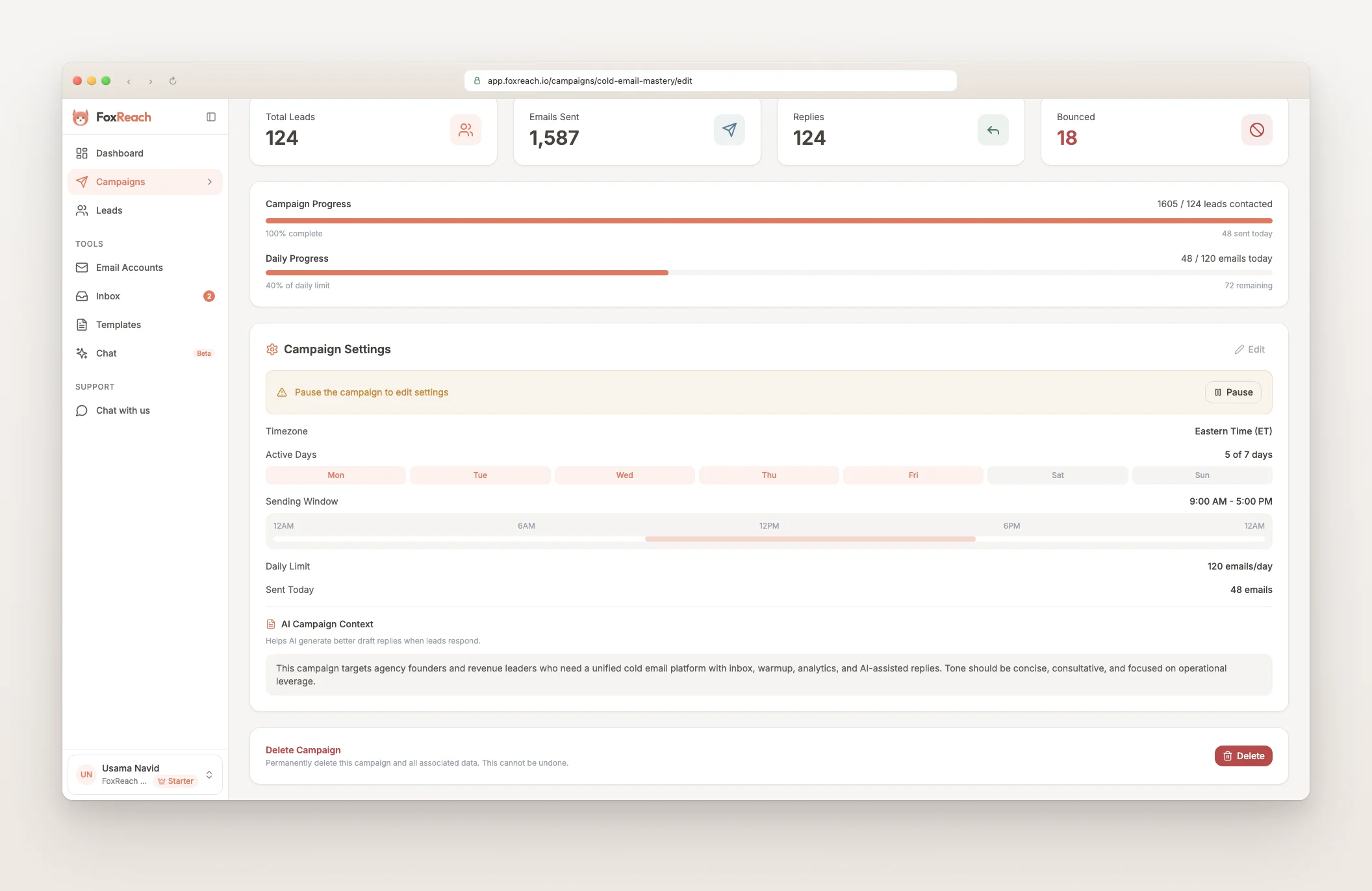 We are FoxReach, a cold email outreach platform. Our key value proposition is helping B2B companies automate and scale their outbound email campaigns with built-in warmup, deliverability monitoring, and AI-assisted replies. Tone: Professional, concise, consultative. Not pushy. Goal: Book a 15-minute discovery call. Calendar link: [your link]