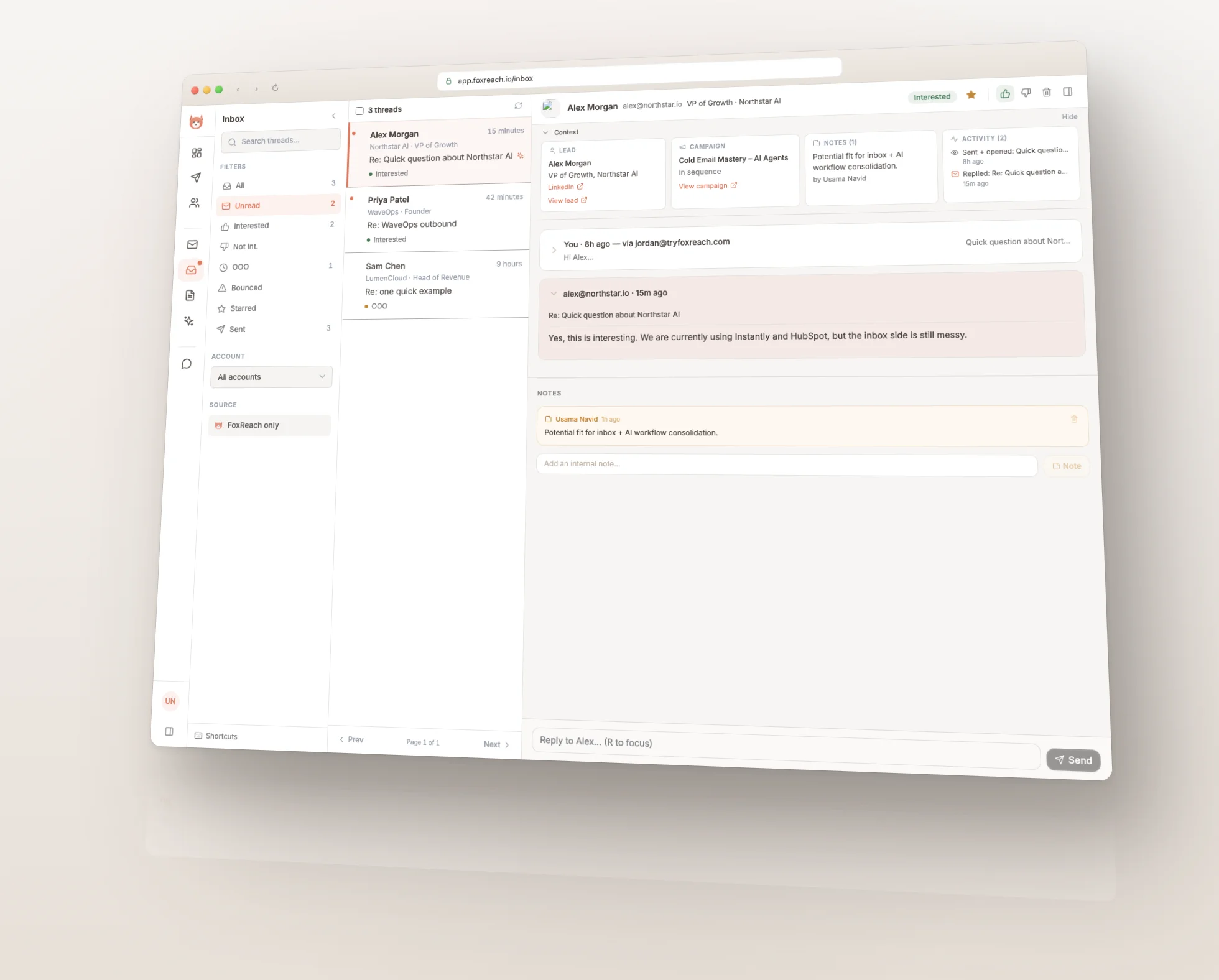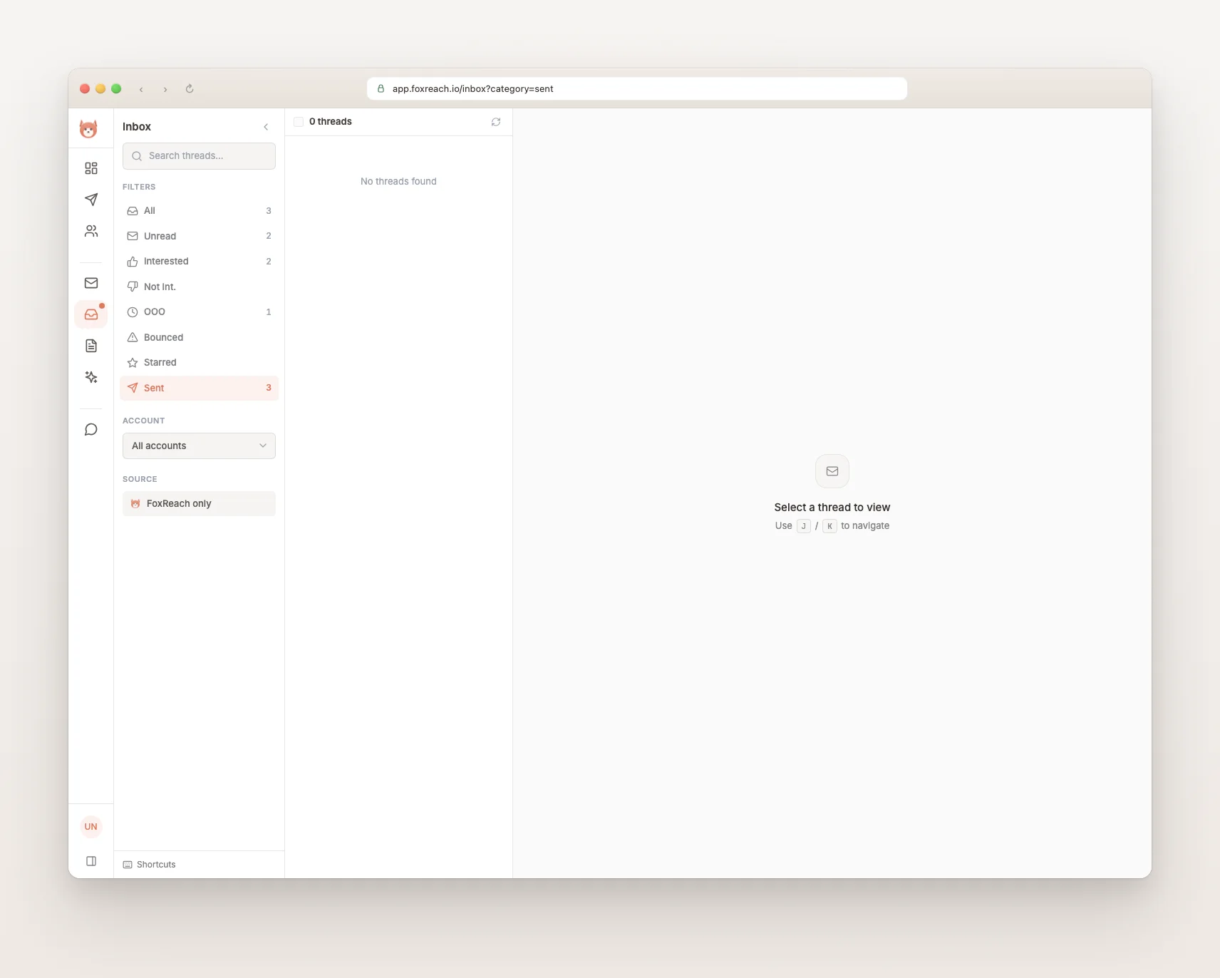 Every reply from every campaign and every email account flows into a single unified inbox inside FoxReach. No switching between Gmail accounts. No lost threads.